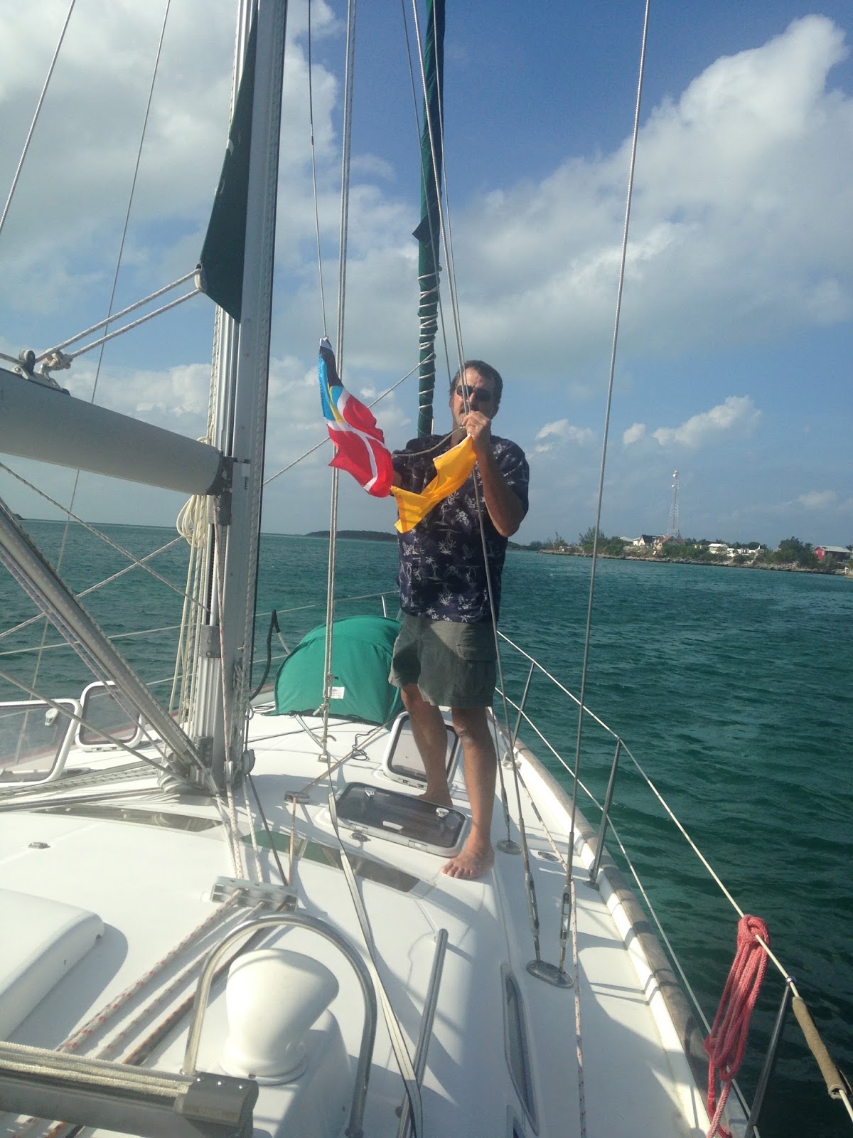 Once we cleared the inlet, we turned SE towards Memory Rock, which is north of West End, Grand Bahamas. We also put up our jenny sail. We now had a 10k SE wind and not a very good angle on the wind. So we brought the jenny in, but left up the main sail for the duration of the passage. We were in some rolling swells averaging 6 feet in height.