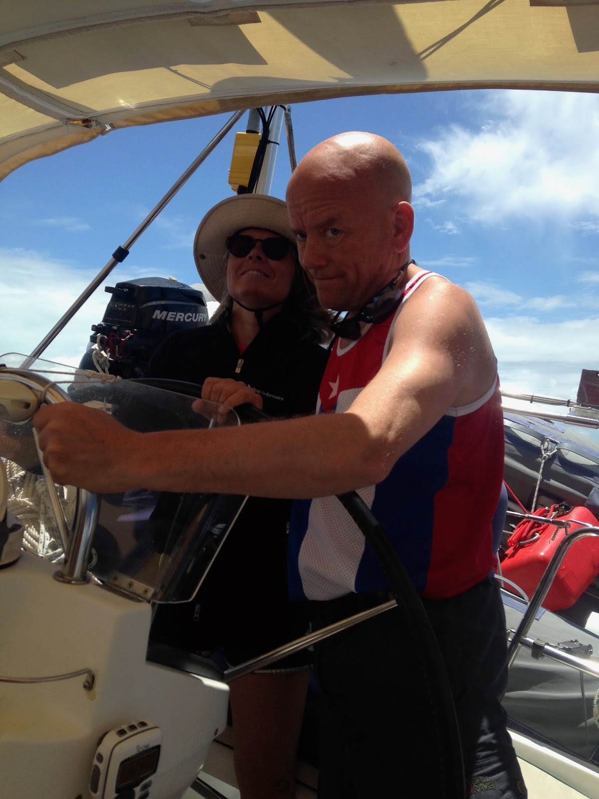 Once we were through the channel, we wanted to pick up a mooring ball. We had talked to the owner, Bandit, by radio and they recommended #4 or 5. We didn’t know what their numbering system was, so we just grabbed the easiest one for us to pick up. With the wind blowing, we rounded the mooring ball a couple times. In the middle of everything, we got a call on the VHF. I thought it might be someone telling us not to take that ball. I had Anne-Marie take over the helm while I talked to another boat in the mooring field. He explained to me that the pendant that we had to grab was tied to a white milk jug that was submerged. That was then tied to the mooring ball. That helped. We finally were successful with our second boat hook. Yes, we lost one in the process.